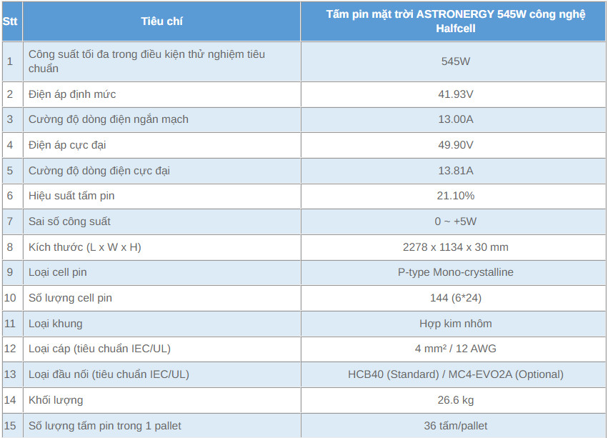 Thông số kỹ thuật của tấm pin mặt trời ASTRONERGY 545Wp