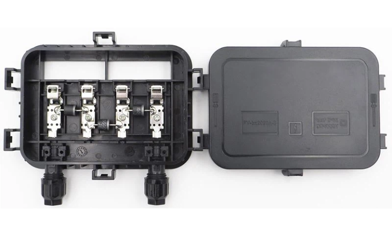 Nằm ở phía sau bảng điều khiển là hộp nối. Nó được dùng chứa các dây cáp để kết nối những tấm pin trong hệ thống, có chức năng đưa mối nối điện của mô đun pin mặt trời ra ngoài. Khi chọn hộp đựng mối nối mạch điện pin mặt trời bạn cần chú ý đến chất lượng nhựa và độ tốt của khớp nối.