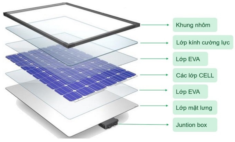 Về cơ bản, pin năng lượng mặt trời được tạo thành từ các bộ phận gồm solar cell, lớp kính cường lực, lớp màng EVA, tấm nền pin, khung nhôm và hộp nối.
