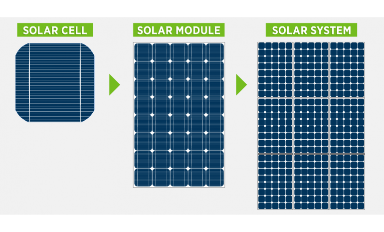 Tấm pin mặt trời cấu tạo từ nhiều đơn vị nhỏ hơn là tế bào quang điện. Chúng là phần tử bán dẫn có thành phần chính là silic tinh khiết dạng đơn tinh thể hoặc đa tinh thể tùy vào quy trình sản xuất của mỗi hãng.